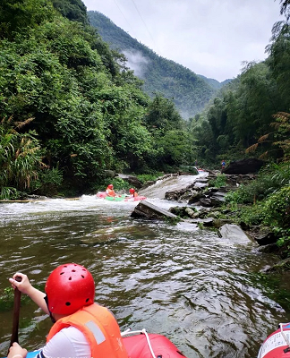 漂到后面,河道落差小,遇到激流就比較平靜了,可以靜靜的欣賞著河道兩岸的風景了。沒想到云姐和小楊竟然打起了水戰,互相潑水,橡皮筏也在他們激烈的戰斗下轉圈,也不知道潑到我身上的水是誰潑的,同事們看他們玩的十分的歡樂,也紛紛加入了他們的戰斗。此時此刻,大家都像回到了童年時光,像孩童一樣嬉戲玩鬧,小編只后悔自己沒有帶上手機,定格住沿岸的風景和大家的歡聲笑語。